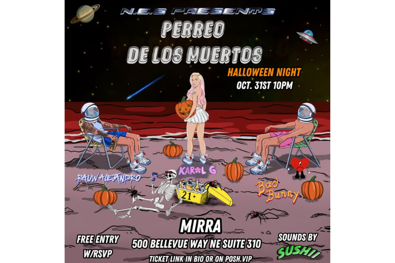PERREO DE LOS MUERTOS lands at Mirra this Halloween night! Get ready for a reggaeton takeover — space vibes, wild energy, and beats by @djsushii_ Free entry with RSVP.