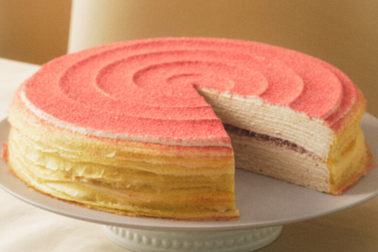 Tart, creamy, and sweet, our popular Strawberry Swirl Mille Crêpes brings together decadent strawberry-infused sponge cake, paper-thin crêpes, and strawberry pieces. Finished with an elegant swirl of strawberry pastry cream and strawberry powder.
