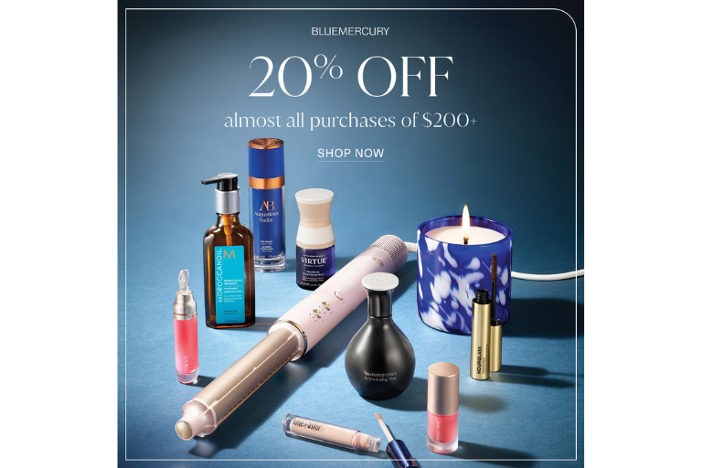 Receive 20% off almost all purchases of $200+ between Thursday, January 15, at 12:00 a.m. EST and Monday, January 19, 2026, at 2:59 a.m. EST, in stores and online. Offer cannot be combined with any other coupons, discounts, promotions, or offers, redeemed for cash, or used for prior purchases. Offer not valid on gift cards, spa services, Aesop, Bluemercury exclusive sets, Charlotte Tilbury, Dr. Diamond’s Metacine, Dyson, Jan Marini, Oribe, Ranavat, SkinCeuticals, Victoria Beckham Beauty, or Vintner’s Daughter.