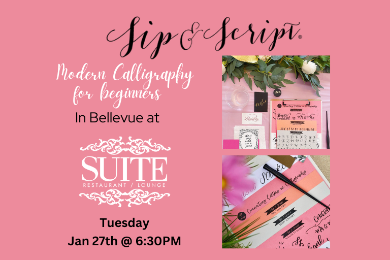 Join us at SUITE Restaurant & Lounge in Bellevue, WA for pretty lettering! Whether you’re a stationery nerd, DIY Bride-to-be, or just a crafty individual, you’ll be introduced to modern calligraphy with a pointed dip pen and ink in this workshop. We will cover all the basics and prepare you to add those unique lettered details to your snail mail, wedding paper goods, home decor, and more! The perfect crafty night out! Class includes 1.5 hours of instruction and demonstration, our beginner’s calligraphy kit (two nibs, black ink pot, 2 letter guides, tracing paper, and straight pen holder), and all materials to write on. Everything is yours to keep at the end of the workshop!