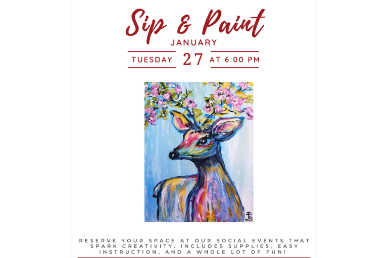 Tuesday, January 27th, join us from 6-8 pm for a fun sip & paint activity " Oh Deer" hosted by Corks & Canvas Events at Suite. Includes step-by-step instruction, all supplies, brushes, aprons, and easels. Come hungry, full menu service available before, during or after the event.